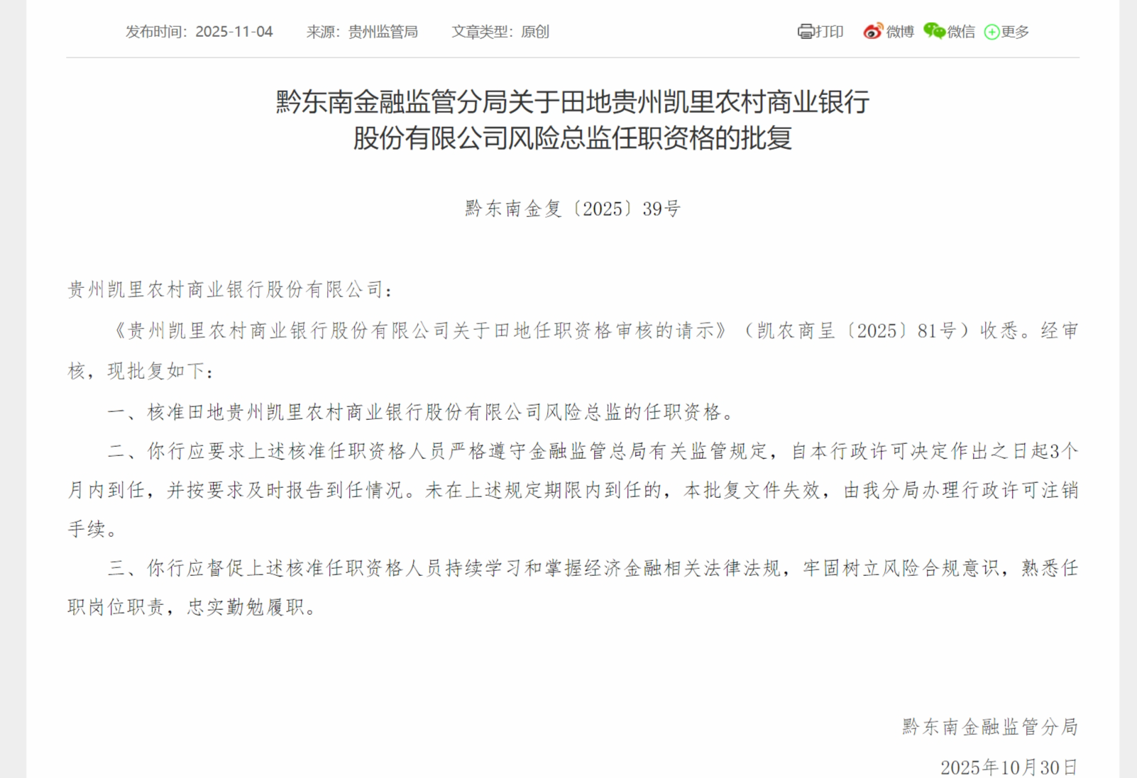 11月4日,黔东南金融监管分局发布关于田地贵州凯里农村商业银行股份有限公司风险总监任职资格的批复,核准田地贵州凯里农村商业银行股份有限公司风险总监的任职资格。