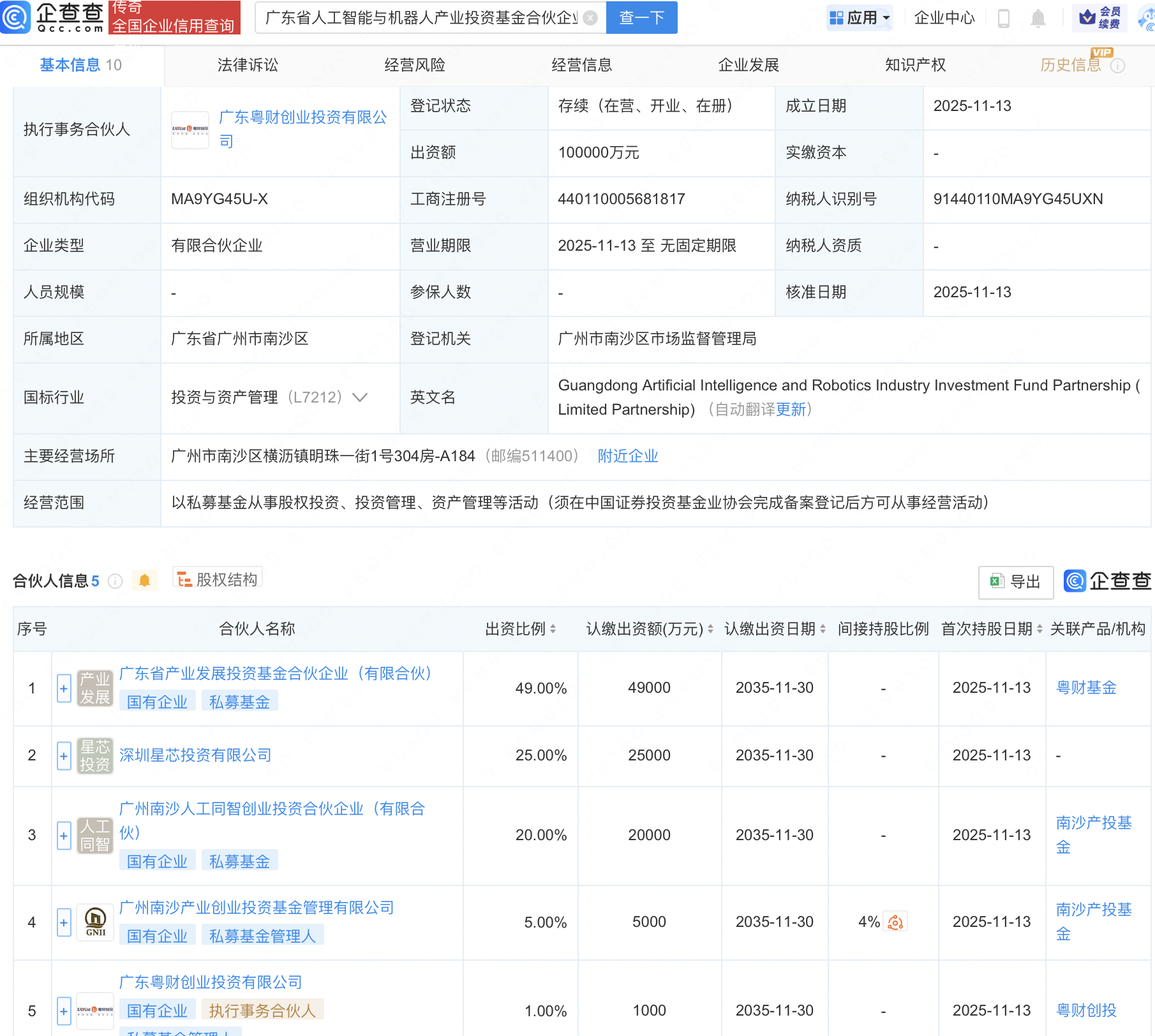 近日,广东省人工智能与机器人产业投资基金合伙企业(有限合伙)成立,出资额10亿元,经营范围包含:以私募基金从事股权投资、投资管理、资产管理等活动。企查查股权穿透显示,该企业由广东省产业发展投资基金合伙企业(有限合伙)等共同出资。